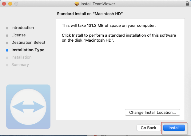 - Beim Punkt „Installationstyp“ wird „TeamViewer“ automatisch auf dem Datenträger „Macintosh HD“ installiert.