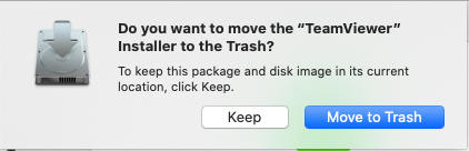 - HINWEIS: Im Installationsfenster werden Sie möglicherweise gefragt, ob Sie den „TeamViewer Installer“ in den Papierkorb verschieben möchten. Dies hat keinen Einfluss auf die Installation von „TeamViewer“, sondern verschiebt die Datei „TeamViewer.dmg“ automatisch in den Papierkorb