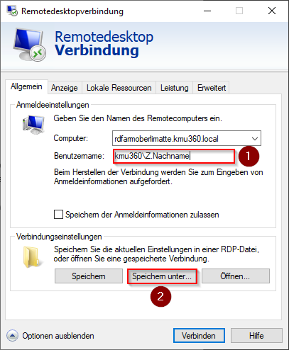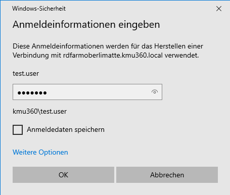 - Unter Benutzername den Login Namen eintragen z.B. «Kmu360\Z.Nachname»