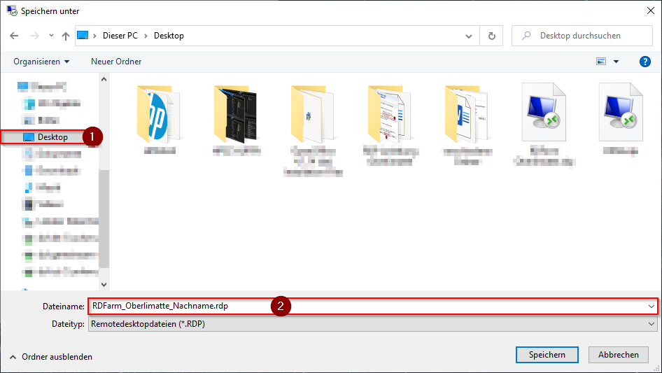 - Im anschliessenden Fenster drücken wir zunächst auf «Desktop», damit es auf Desktop ersichtlich wird. Im Anschluss daran geben wir nun einen personalisierten Namen für die RDP-Datei an, damit jeder User auf dem Notebook eine eigene Verbindung hat. Um es einheitlich zu halten, würde ich folgenden Namen vorschlagen: