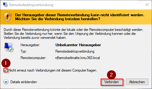 - Bei dieser Kontextmenü «Nicht erneut nach Verbindungen mit diesem Computer fragen» wählen und mit «Verbinden» bestätigen.