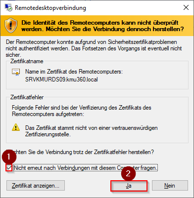 - Bei diesem Kontextmenü «Nicht erneut nach Verbindungen mit diesem Computer fragen» wählen und mit «Ja» bestätigen